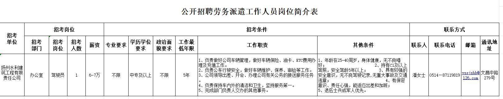 2023年揚州水利建筑工程有限責任公司 招聘勞務派遣工作人員公告