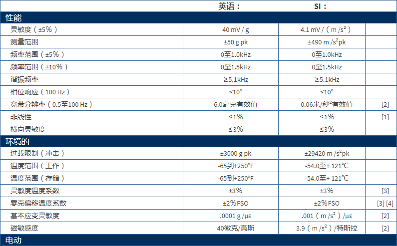 MEMS直流加速度計,40 mV / g,+/- 50 g范圍,0至1000 Hz,4針連接器靈敏度:(±5%)40 mV / g(4.1 mV /(m /s2))測量范圍:±50 g pk(±490 m /s2pk)寬帶分辨率:6.0 mg rms(0.06 m /s2rms)溫度范圍:-65至+250°F(-54.0至+121°C)頻率范圍:(±5%)0至1.0 kHz